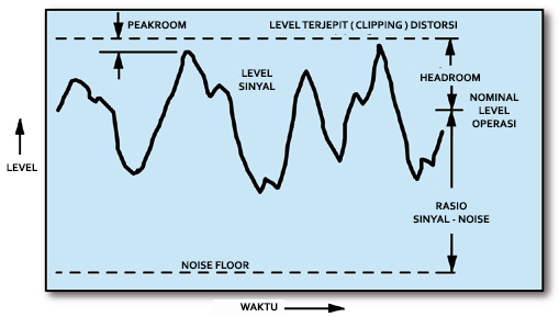 Perbedaan level dalam dB antara level sinyal nominal (rata rata ) dan level puncak disebut dengan “headroom” (Gambar 1). Semakin besar ruang headroom, semakin tinggi level sinyal dari perangkat yang dapat lewat tanpa terjepit.