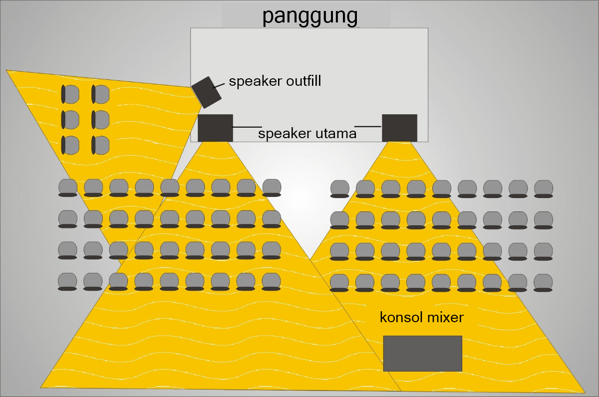 Sebagai panduan umum, jika kalian tidak bisa melihat mulut dari corong speaker, maka kalian tidak akan bisa mendengarnya. Cobalah untuk mengarahkan pengeras suara langsung ke bagian ruangan yang paling penting. Dan jika, contohnya, ada sekumpulan pendengar yang duduk langsung disamping panggung, speaker tambahan bisa kalian pakai untuk melayani mereka. Speaker untuk keperluan ini tidak membutuhkan banyak respon suara bass, namun memerlukan pola dispersi yang selebar mungkin