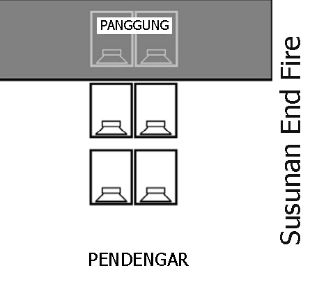 Susunan Tembakan Ujung atau End Fire Array. Beberapa kabinet dapat kalian susun dalam satu barisan, disusun satu didepan lainnya dengan posisi semua mengarah kedepan. Semua kabinet di delay dalam relasinya dengan kabinet yg paling belakang. Pendekatan ini memungkinkan kalian untuk memproyeksikan arah tendangan suara bass direksional yg kuat dalam jarak yg jauh. Gambar No 6 menunjukkan cara kerja dari teknik end fire array ini dalam menyediakan kontrol pola yg sangat baik pada frekuensi 80 Hz.