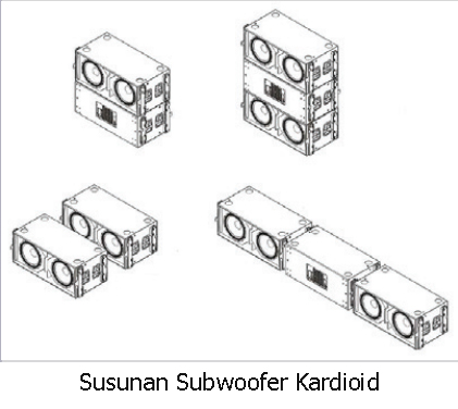 Susunan Kardioid. Dua teknik kardioid yg umum adalah dengan membariskan unit subwoofer saling berdampingan. Menumpuknya satu diatas lainnya , dengan satu kabinet (umumnya yg ditengah dalam susunan 3 unit) dibalik mengarah ke belakang. Memberiskannya satu sama lain dan membalik posisi unit yg di tengah kearah sebaliknya.