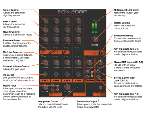 Mixer 8 kanal yg terintegrasi menyediakan solusi pencampuran audio untuk beragam aplikasi. Saluran 1 sampai 4 dapat menerima kedua jenis konektor ¼ inci atau XLR dan menyediakan fungsi pengaturan volume, reverb, dan kontrol treble bass ,membuatnya sempurna untuk aplikasi DJ,penyanyi, pemain instrumen dan pemandu acara. Selanjutnya, saluran 1 sampai 3 memungkinkan masukan yg membutuhkan daya ohantom dan impedansi tinggi atau Hi Z, lalu penggunanya dapat langsung menghubungkan gitar elektrik atau mikrofon atau perangkat audio lainnya yg membutuhkan daya phantom.