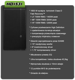 Fitur keren dari EQ ini adalah kemampuan mendorong dan memotong setiap frekuensi sebesar 3 dB. Sangat membantu dan tidak akan menyulitkan pengguna awam dalam melakukan pengaturan. Cekukan frekuensi tengah mulai dari 100Hz sampai 8kHz dengan nilai Q 1.5. Unit juga dilengkapi dengan lubang tiang sehingga pemakai dapat menggunakan tiang speaker dan tambahan 12 titik penggantungan.Dengan bobot hanya 96 lbs atau setara dengan 43.5 kg ,cukup portabel untuk sebuah sistem speaker tiga arah.