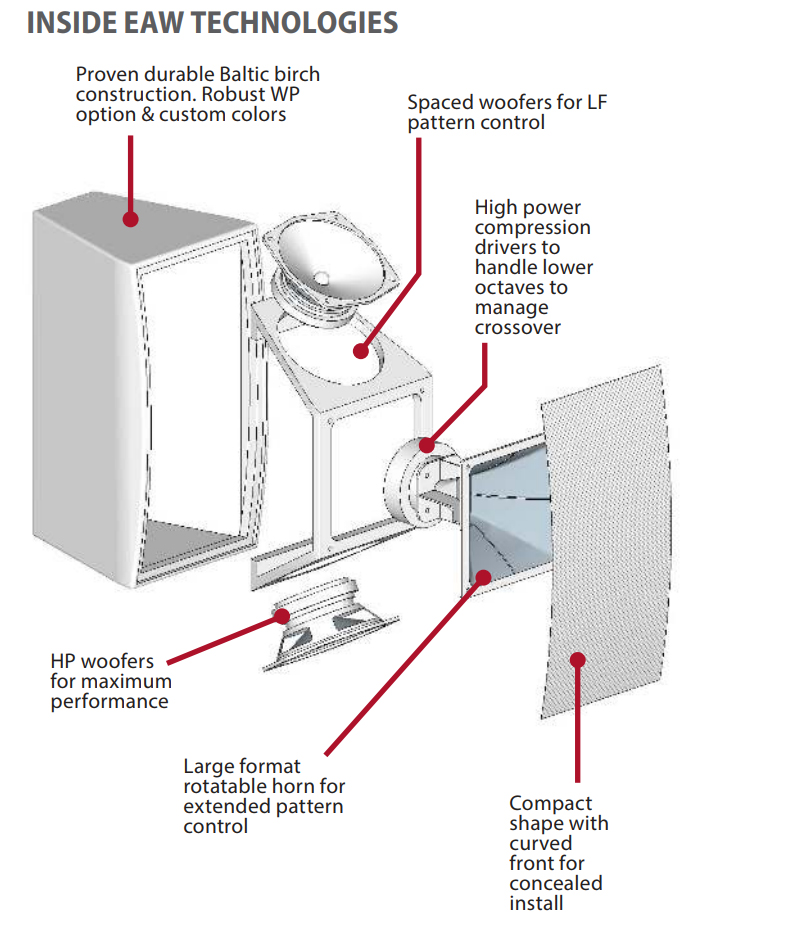 EAW MKD membawa desain dan teknologi inti yg dipakai pada EAW seri QX dengan memanfaatkan sepasang komponen penggerak frekuensi rendah yg mengapit sebuah corong pemandu gelombang suara berukuran besar yg dapat diputar. Komponen transduser yg teroptimasi secara akustik dapat digerakkan satu oktaf lebih rendah dibandingkan dengan komponen speaker standar lewat penggunaan teknologi titik persilangan frekuensi beamwidth matched.